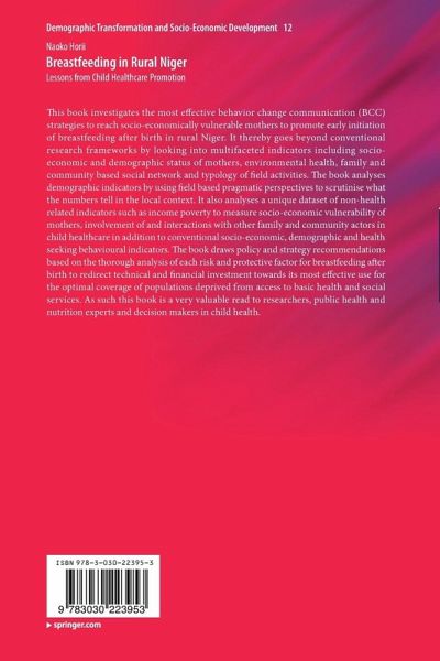 This book investigates the most effective behavior change communication (BCC) strategies to reach socio-economically vulnerable mothers to promote early initiation of breastfeeding after birth in rural Niger. It thereby goes beyond conventional research frameworks by looking into multifaceted indicators including socio-economic and demographic status of mothers, environmental health, family and community based social network and typology of field activities. The book analyses demographic indicators by using field based pragmatic perspectives to scrutinise what the numbers tell in the local context. It also analyses a unique dataset of non-health related indicators such as income poverty to measure socio-economic vulnerability of mothers, involvement of and interactions with other family and community actors in child healthcare in addition to conventional socio-economic, demographic and health seeking behavioural indicators. The book draws policy and strategy recommendations based on the thorough analysis of each risk and protective factor for breastfeeding after birth to redirect technical and financial investment towards its most effective use for the optimal coverage of populations deprived from access to basic health and social services. As such this book is a very valuable read to researchers, public health and nutrition experts and decision makers in child health.