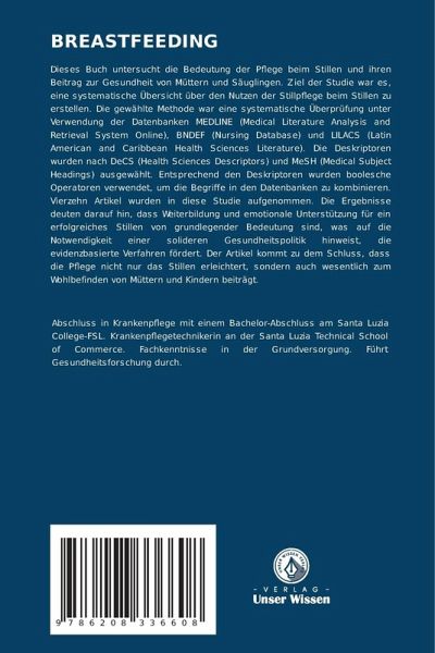 Dieses Buch untersucht die Bedeutung der Pflege beim Stillen und ihren Beitrag zur Gesundheit von Müttern und Säuglingen. Ziel der Studie war es, eine systematische Übersicht über den Nutzen der Stillpflege beim Stillen zu erstellen. Die gewählte Methode war eine systematische Überprüfung unter Verwendung der Datenbanken MEDLINE (Medical Literature Analysis and Retrieval System Online), BNDEF (Nursing Database) und LILACS (Latin American and Caribbean Health Sciences Literature). Die Deskriptoren wurden nach DeCS (Health Sciences Descriptors) und MeSH (Medical Subject Headings) ausgewählt. Entsprechend den Deskriptoren wurden boolesche Operatoren verwendet, um die Begriffe in den Datenbanken zu kombinieren. Vierzehn Artikel wurden in diese Studie aufgenommen. Die Ergebnisse deuten darauf hin, dass Weiterbildung und emotionale Unterstützung für ein erfolgreiches Stillen von grundlegender Bedeutung sind, was auf die Notwendigkeit einer solideren Gesundheitspolitik hinweist, die evidenzbasierte Verfahren fördert. Der Artikel kommt zu dem Schluss, dass die Pflege nicht nur das Stillen erleichtert, sondern auch wesentlich zum Wohlbefinden von Müttern und Kindern beiträgt.