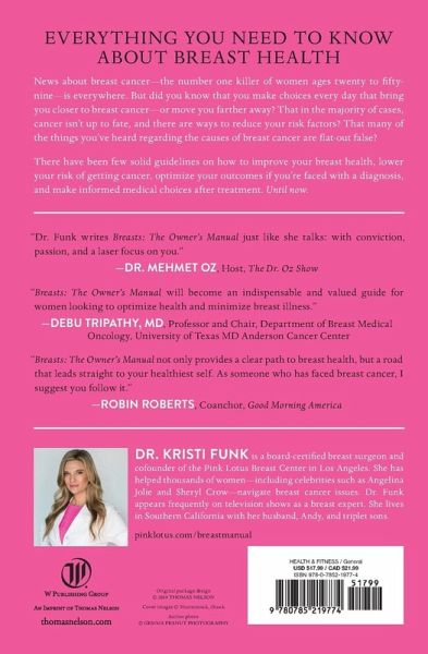 A national bestseller! Breast cancer surgeon Dr. Kristi Funk offers a comprehensive and encouraging approach to breast care and breast cancer. Empower yourself with facts and strategies to understand your breasts, reduce your cancer risk, and open your eyes to interventions and treatments. Most women don't want to hear about breast cancer unless they have it and need to make some decisions, but these days news about breast cancer--the number one killer of women ages twenty to fifty-nine--is everywhere. Chances are you know someone who has had it. But did you know that choices you make every day bring you closer to breast cancer--or move you farther away? That there are ways to reduce your risk factors? And that many of the things you've heard regarding the causes of breast cancer are flat-out false? Based on Dr. Kristi Funk's experience as a board-certified breast cancer surgeon, she knows for a fact that women have the power to reduce breast cancer risk in dramatic ways. Many women believe that family history and genetics determine who gets breast cancer, but that's not true for most people. In fact, 87 percent of women diagnosed with breast cancer do not have a single first-degree relative with breast cancer. This book will help you: * Learn the breast-health basics that every woman should know * Reduce your cancer risk and recurrence risk based on food choices and healthy lifestyle changes backed by rigorous scientific research * Understand the controllable and uncontrollable risk factors for breast cancer * Outline your medical choices if you're at elevated risk for or are already navigating life with breast cancer There have been few solid guidelines on how to improve your breast health, lower your risk of getting cancer, and make informed medical choices after treatment--until now. With her book available in 10 languages and in more than 30 countries, Dr. Funk is passionate about her mission of educating as many women as possible about what they can do to stop breast cancer before it starts. Praise for Breasts: The Owner's Manual: "Dr. Funk writes Breasts: The Owner's Manual just like she talks: with conviction, passion, and a laser focus on you."--Dr. Mehmet Oz, Host of The Dr. Oz Show "Breasts: The Owner's Manual will become an indispensable and valued guide for women looking to optimize health and minimize breast illness."--Debu Tripathy, MD, Professor and Chair, Department of Breast Medical Oncology, University of Texas MD Anderson Cancer Center "Breasts: The Owner's Manual not only provides a clear path to breast health, but a road that leads straight to your healthiest self. As someone who has faced breast cancer, I suggest you follow it."--Robin Roberts, Co-anchor, Good Morning America