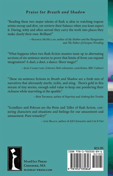"Reading these two major talents of flash is akin to watching trapeze artists swoop and dive, yet retrieve their balance when you least expect it. Daring, witty and often surreal they carry the work into places they make clearly their own. Brilliant!" -Frankie McMillan, author of My Mother and the Hungarians and The Father of Octopus Wrestling "What happens when two flash fiction masters team up in alternating sections of six-sentence stories to prove that limits of form can expand imagination? A duel, a duet, a dance. Sheer magic!" -Jane Ciabattari, (Literary Hub columnist, contributor, BBC Culture) "These six-sentence fictions in Breath and Shadow are a fresh mix of narratives that alternately startle, tickle, and sting. There's gold in this stream of tiny stories, enough solid value to keep one pondering their richness while marveling at the sparkle." -Bob Thurber, author of Paperboy and Nothing But Trouble "Scotellaro and Pokrass are the Penn and Teller of flash fiction, con- juring characters and situations and feelings for our amazement and amusement. Pure wizardry!" -Lou Beach, author of 420 Characters and Cut It Out