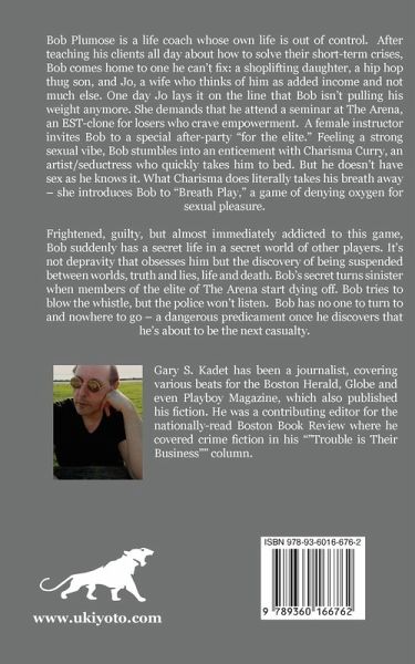 Bob Plumose is a life coach whose own life is out of control. After teaching his clients all day about how to solve their short-term crises, Bob comes home to one he can't fix: a shoplifting daughter, a hip hop thug son, and Jo, a wife who thinks of him as added income and not much else. One day Jo lays it on the line that Bob isn't pulling his weight anymore. She demands that he attend a seminar at The Arena, an EST-clone for losers who crave empowerment. A female instructor invites Bob to a special after-party "for the elite." Feeling a strong sexual vibe, Bob stumbles into an enticement with Charisma Curry, an artist/seductress who quickly takes him to bed. But he doesn't have sex as he knows it. What Charisma does literally takes his breath away - she introduces Bob to "Breath Play," a game of denying oxygen for sexual pleasure. Frightened, guilty, but almost immediately addicted to this game, Bob suddenly has a secret life in a secret world of other players. It's not depravity that obsesses him but the discovery of being suspended between worlds, truth and lies, life and death. Bob's secret turns sinister when members of the elite of The Arena start dying off. Bob tries to blow the whistle, but the police won't listen. Bob has no one to turn to and nowhere to go - a dangerous predicament once he discovers that he's about to be the next casualty.
