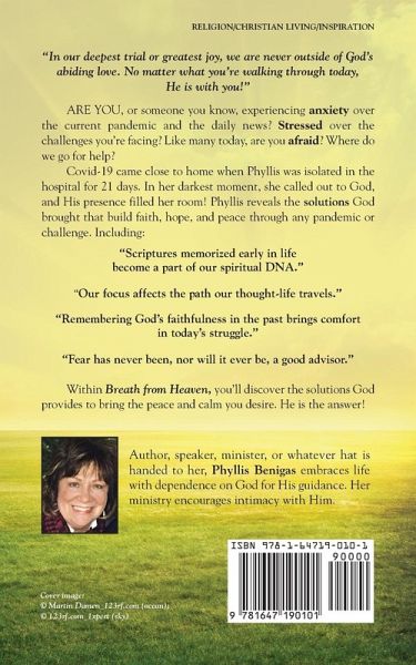 The Covid-19 pandemic came close to home when Phyllis received the grave diagnosis of a 75% lung infection from the coronavirus. Connected to a ventilator for days, hospitalized for weeks, followed by months of recovery required a supernatural intervention for survival from the Lord. When she called out to Him, she felt His presence fill her hospital room! And over the next several days, He provided the guidance she needed to build her faith, bring peace to her heart, and overcome the desperate fear and uncertainty she was facing. As her story unfolds, Phyllis shares how God filled her mind with dozens of scriptures memorized as a child, each one building her faith. When she was unable to sleep, He filled her with songs in the night. He brought back memories of His endless acts of faithfulness to her in the past. As Phyllis shares many of them, you will be encouraged too. Because the Lord was with her, she was full of thanksgiving and praise despite her situation. Phyllis reveals many additional ways God gave her peace through every examination, treatment, and questioning moment. We are not alone in our struggle! God is with us! Are you, or someone you know, experiencing anxiety over the current pandemic and the daily news? Or stressed over the challenges you're facing? Like many today, are you afraid? Perhaps you're questioning, where do I go for help? ¿ God longs to provide everything you need to guide you to victory each day, with peace along the way. Phyllis' story will encourage you to call on Him and believe Him for the guidance you need. Even if your life is struggle-free at the moment, the strategies given here will help you encourage loved ones and friends facing struggles with their health, their relationships, or loss of any kind. Why is God so faithful to answer our call for help? Because He loves us! As Phyllis explores the depths of God's love, she encourages us to discover His love in a greater way than ever before, explore the breadth, length, depth, and heights of His love. You will never be the same!