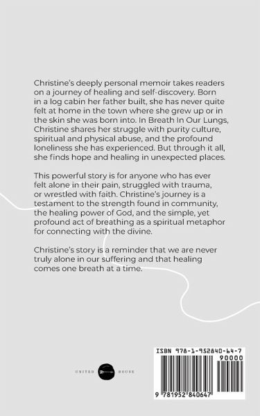 Christine's deeply personal memoir takes readers on a journey of healing and self-discovery. Born in a log cabin her father built, she has never quite felt at home in the town where she grew up or in the skin she was born into. In Breath In Our Lungs, Christine shares her struggle with purity culture, spiritual and physical abuse, and the profound loneliness she has experienced. But through it all, she finds hope and healing in unexpected places. This powerful story is for anyone who has ever felt alone in their pain, struggled with trauma, or wrestled with faith. Christine's journey is a testament to the strength found in community, the healing power of God, and the simple, yet profound act of breathing as a spiritual metaphor for connecting with the divine. Inside, you'll find: - A journey through heartache, trauma, and spiritual growth - The metaphor of breath as a connection to God's Spirit, from Genesis 1 - A raw exploration of silence in the church surrounding grief, abuse, and suffering - Encouragement for those who feel isolated in their stories, showing that healing is possible - A message of hope through connecting to God, community, and the rhythm of breath Christine's story is a reminder that we are never truly alone in our suffering and that healing comes one breath at a time.