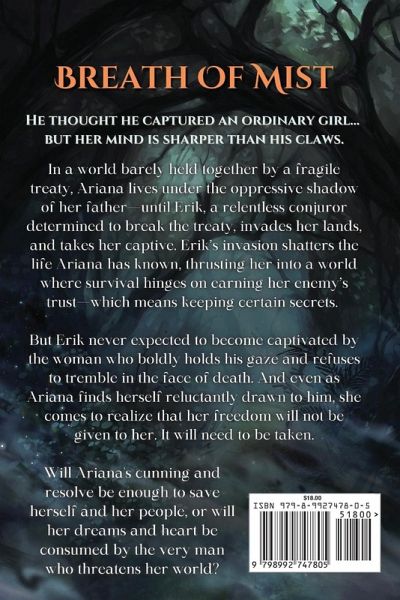 In a world barely held together by a fragile treaty, Ariana lives under the oppressive shadow of her monstrous father-until Erik, a relentless conjuror determined to break the treaty, invades her lands, executes her father, and takes her captive. Erik's invasion shatters the life Ariana has known, thrusting her into a precarious battle where survival hinges on earning her enemy's trust-which means concealing the mist-conjuring power flowing through her veins. With the number of elemental and shadow conjurers dwindling, Ariana must avoid being seen as a threat. Because Ariana has been chosen to be her people's next leader, Erik believes that by controlling her, he can use her armies and resources to save his own people: to rescue his sister and other conjurors who have been disappearing. But he never expected to become captivated by the woman who boldly holds his gaze and refuses to tremble in the face of death. And even as Ariana finds herself reluctantly drawn to him in turn, she comes to realize that her freedom will not be given to her. It will need to be taken. Despite Erik's attempts to keep her isolated, Ariana weaves her way into the lives of those around her, gathering potential allies for the time when she ultimately reveals her secrets and attempts to free herself from Erik's control. Will Ariana's cunning and resolve be enough to save herself and her people, or will her dreams and heart be consumed by the very man who threatens her world?