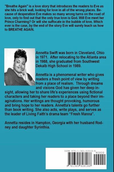 "Breathe Again" is a love story that introduces the readers to Eve as she hits a brick wall, looking for love in all of the wrong places. Because of desperation Eve makes so many wrong turns on the road of love, only to find out that the only true love is God. Will Eve meet her Prince Charming? Or will she suffocate in the bubble of love. Which ever is the case, by the end of the story Eve will surely teach us how to BREATHE AGAIN.