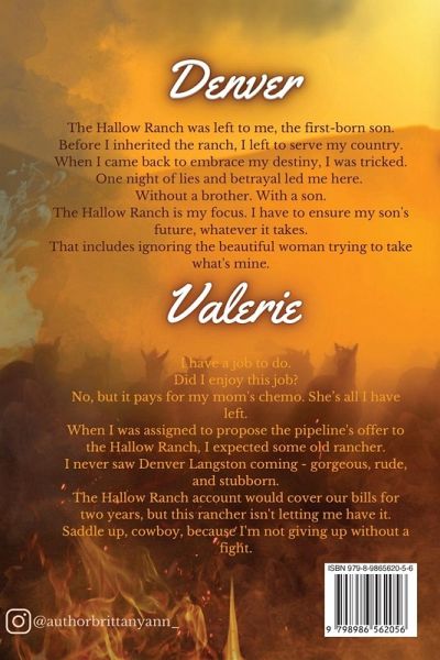 DENVER The Hallow Ranch was left to me, the first-born son. Before I inherited the ranch, I left to serve my country. When I came back to embrace my destiny, I was tricked. One night of lies and betrayal led me here. Without a brother. With a son. The Hallow Ranch is my focus. I have to ensure my son's future, whatever it takes. That includes ignoring the beautiful woman trying to take what's mine. VALERIE I have a job to do. Did I enjoy this job? No, but it pays for my mom's chemo. She's all I have left. When I was assigned to propose the pipeline's offer to the Hallow Ranch, I expected some old rancher. I never saw Denver Langston coming - gorgeous, rude, and stubborn. The Hallow Ranch account would cover our bills for two years, but this rancher isn't letting me have it. Saddle up, cowboy, because I'm not giving up without a fight.