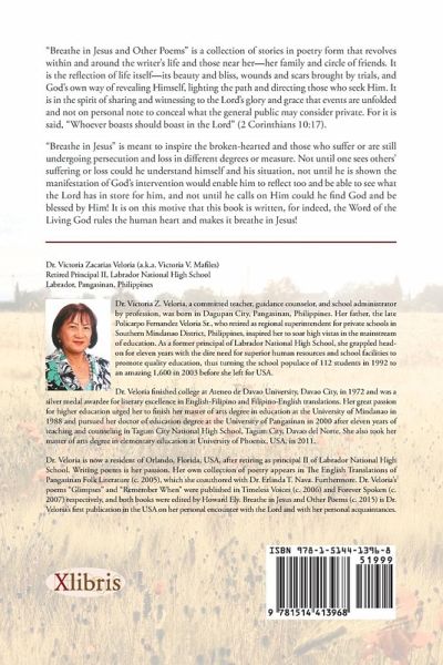 Dr. Victoria Zacarias Veloria (a.k.a. Victoria V. Mafiles) Retired Principal II, Labrador National High School Labrador, Pangasinan, Philippines Dr. Victoria Z. Veloria, a committed teacher, guidance counselor, and school administrator by profession, was born in Dagupan City, Pangasinan, Philippines. Her father, the late Policarpo Fernandez Veloria Sr., who retired as regional superintendent for private schools in Southern Mindanao District, Philippines, inspired her to soar high vistas in the mainstream of education. As a former principal of Labrador National High School, she grappled head-on for eleven years with the dire need for superior human resources and school facilities to promote quality education, thus turning the school populace of 112 students in 1992 to an amazing 1,600 in 2003 before she left for USA. Dr. Veloria finished college at Ateneo de Davao University, Davao City, in 1972 and was a silver medal awardee for literary excellence in English-Filipino and Filipino-English translations. Her great passion for higher education urged her to finish her master of arts degree in education at the University of Mindanao in 1988 and pursued her doctor of education degree at the University of Pangasinan in 2000 after eleven years of teaching and counseling in Tagum City National High School, Tagum City, Davao del Norte. She also took her master of arts degree in elementary education at University of Phoenix, USA, in 2011. Dr. Veloria is now a resident of Orlando, Florida, USA, after retiring as principal II of Labrador National High School. Writing poems is her passion. Her own collection of poetry appears in The English Translations of Pangasinan Folk Literature (c. 2005), which she coauthored with Dr. Erlinda T. Nava. Furthermore. Dr. Veloria's poems "Glimpses" and "Remember When" were published in Timeless Voices (c. 2006) and Forever Spoken (c. 2007) respectively, and both books were edited by Howard Ely. Breathe in Jesus and Other Poems (c. 2015) is Dr. Veloria's first publication in the USA on her personal encounter with the Lord and with her personal acquaintances.