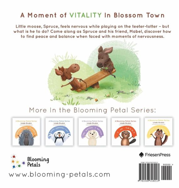Little moose, Spruce, feels nervous while playing on the teeter-totter - but what is he to do? Come along as Spruce and his friend Mabel discover how to find peace and balance when faced with moments of nervousness. Breathe to Relieve is the second installment in the Blooming Petals series. In this charming story, unsure how to calm his anxious feelings, Spruce turns to Bruce, who teaches him about mindful breathing. Equipped with this new skill, Spruce meets his friend Mabel at the park to play on the teeter-totter again. When Mabel notices Spruce closing his eyes, her curiosity sparks a discussion that leads them to explore how mindful breathing can help manage their feelings. This heartwarming story introduces children to self-regulation through managing anxiety and encourages open discussions about feelings, making it a valuable tool for young readers and their caregivers alike. Blooming Petals is a six-book series centred on evidence-based positive psychology. The series is rooted in acceptance, connection and sustained growth of the caregiver-child relationship. A guiding resource for parents, educators, caregivers, and counsellors, the series offers a gentle and connected experience to nurture growth and flourishing.