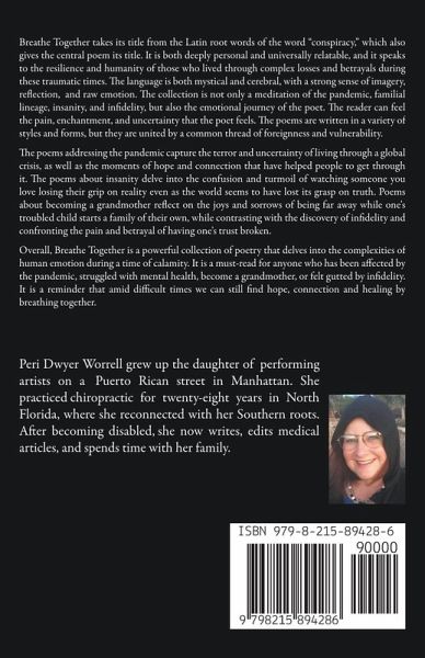 Breathe Together takes its title from the Latin root words of the word "conspiracy," which also gives the central poem its title. It is both deeply personal and universally relatable, and it speaks to the resilience and humanity of those who lived through complex losses and betrayals during these traumatic times. The language is both mystical and cerebral, with a strong sense of imagery, reflection, and raw emotion. The collection is not only a meditation of the pandemic, familial lineage, insanity, and infidelity, but also the emotional journey of the poet. The reader can feel the pain, enchantment, and uncertainty that the poet feels. The poems are written in a variety of styles and forms, but they are united by a common thread of foreignness and vulnerability. The poems addressing the pandemic capture the terror and uncertainty of living through a global crisis, as well as the moments of hope and connection that have helped people to get through it. The poems about insanity delve into the confusion and turmoil of watching someone you love losing their grip on reality even as the world seems to have lost its grasp on truth. Poems about becoming a grandmother reflect on the joys and sorrows of being far away while one's troubled child starts a family of their own, while contrasting with the discovery of infidelity and confronting the pain and betrayal of having one's trust broken. Overall, Breathe Together is a powerful collection of poetry that delves into the complexities of human emotion during a time of calamity. It is a must-read for anyone who has been affected by the pandemic, struggled with mental health, become a grandmother, or experienced infidelity. It is a reminder that amid difficult times we can still find hope, connection and healing by breathing together. This paperback edition includes photos from the poet's travels.