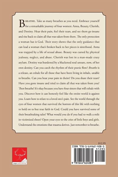 Breathe. Take as many breathes as you need. Embrace yourself for a remarkable journey of four women: Anna, Beauty, Cherish, and Destiny. Hear their pain, feel their tears, and see them go insane and rise back to claim all that was taken from them. The only protection a woman has is God. Their story shows that the only guidance that can lead a woman that's broken back to her pieces is sisterhood. Anna was trapped by a life of sexual abuse. Beauty was cursed by physical jealousy, neglect, and abuse. Cherish was lost in a man-made crazy asylum. Destiny was burdened by a blackened soul unsure, now, of her own destiny. Can you catch the rhythm of their poetic flow? Breathe is a release, an exhale for all those that have been living in inhale, unable to breathe. Can you hear your pain in theirs? Do you share their tears? Have you gone insane and tried to claim all that was taken from you? Then breathe! It's okay because you have four sisters that will exhale with you. Discover how it can honestly feel like the entire world is against you. Learn how to relate to a loved one's pain. See the world through the eyes of four women that survived the horrors of this life with nothing to hold on to but true faith in God. Could you have survived some of their breathtaking tales? What would you do if you had to walk a mile in victimized shoes? Open your eyes to the cries of little boys and girls. Understand the emotions that trauma derives. Just remember to breathe.