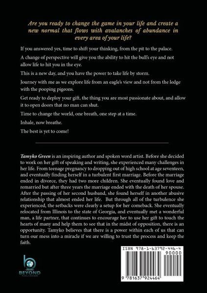 Are you ready to change the game in your life and create a new normal that flows with avalanches of abundance in every area of your life? If you answered yes, time to shift your thinking, from the pit to the palace. A change of perspective will give you the ability to hit the bull's eye and not allow life to hit you in the eye. This is a new day, and you have the power to take life by storm. Journey with me as we explore life from an eagle's view and not from the ledge with the pooping pigeons. Get ready to deploy your gift, the thing you are most passionate about, and allow it to open doors that no man can shut. Time to change the world, one breath, one step at a time. Inhale, now breathe. The best is yet to come! Acknowledgments: I want to acknowledge my best friend and soon-to-be husband, Joey, for encouraging me to stay on the journey. To my children that supported me and showered me with love. To all of my siblings, my friends, and my Pastor, that believed in me and my abilities. To Michael and Dianne, for your support and encouragement and for reminding me that anything I put my mind to, I will accomplish it. To my publisher for helping me through the process every step of the way. To everyone that purchase my book, thank you for your support. I pray it will encourage you and cause you to move in the direction of greatness and unlimited opportunities. Lastly, to my heavenly Father, for without you none of this would be possible. Much gratitude and love!