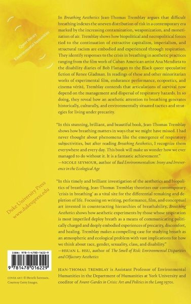 In Breathing Aesthetics Jean-Thomas Tremblay argues that difficult breathing indexes the uneven distribution of risk in a contemporary era marked by the increasing contamination, weaponization, and monetization of air. Tremblay shows how biopolitical and necropolitical forces tied to the continuation of extractive capitalism, imperialism, and structural racism are embodied and experienced through respiration. They identify responses to the crisis in breathing in aesthetic practices ranging from the film work of Cuban American artist Ana Mendieta to the disability diaries of Bob Flanagan, to the Black queer speculative fiction of Renee Gladman. In readings of these and other minoritarian works of experimental film, endurance performance, ecopoetics, and cinema-vérité, Tremblay contends that articulations of survival now depend on the management and dispersal of respiratory hazards. In so doing, they reveal how an aesthetic attention to breathing generates historically, culturally, and environmentally situated tactics and strategies for living under precarity.