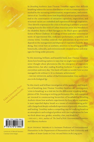 In Breathing Aesthetics Jean-Thomas Tremblay argues that difficult breathing indexes the uneven distribution of risk in a contemporary era marked by the increasing contamination, weaponization, and monetization of air. Tremblay shows how biopolitical and necropolitical forces tied to the continuation of extractive capitalism, imperialism, and structural racism are embodied and experienced through respiration. They identify responses to the crisis in breathing in aesthetic practices ranging from the film work of Cuban American artist Ana Mendieta to the disability diaries of Bob Flanagan, to the Black queer speculative fiction of Renee Gladman. In readings of these and other minoritarian works of experimental film, endurance performance, ecopoetics, and cinema-vérité, Tremblay contends that articulations of survival now depend on the management and dispersal of respiratory hazards. In so doing, they reveal how an aesthetic attention to breathing generates historically, culturally, and environmentally situated tactics and strategies for living under precarity.