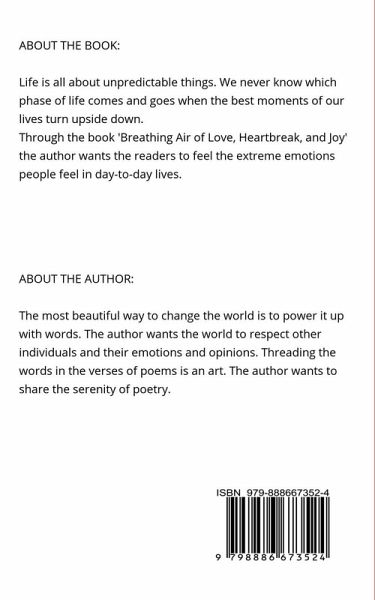 Life is all about unpredictable things. We never know which phase of life comes and goes when the best moments of our lives turn upside down. Through the book 'Breathing Air of Love, Heartbreak, and Joy' the author wants the readers to feel the extreme emotions people feel in day-to-day lives.