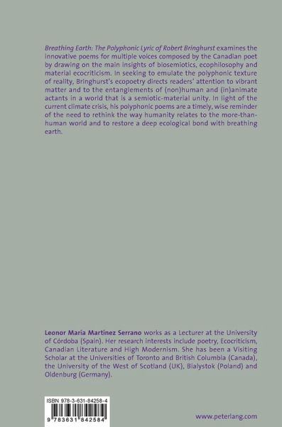 Breathing Earth: The Polyphonic Lyric of Robert Bringhurst examines the innovative poems for multiple voices composed by the Canadian poet by drawing on the main insights of biosemiotics, ecophilosophy and material ecocriticism. In seeking to emulate the polyphonic texture of reality, Bringhurst's ecopoetry directs readers' attention to vibrant matter and to the entanglements of (non)human and (in)animate actants in a world that is a semiotic-material unity. In light of the current climate crisis, his polyphonic poems are a timely, wise reminder of the need to rethink the way humanity relates to the more-than-human world and to restore a deep ecological bond with breathing earth.