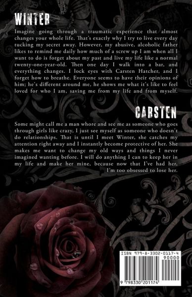 Winter Imagine going through a traumatic experience that almost changes your whole life. That's exactly why I try to live every day tucking my secret away. However, my abusive, alcoholic father likes to remind me daily how much of a screw up I am when all I want to do is forget about my past and live my life like a normal twenty-two-year-old. Then one day I walk into a bar, and everything changes. I lock eyes with Carsten Hatcher, and I forget how to breathe. Everyone seems to have their opinions of him; he's different around me, he shows me what it's like to feel loved for who I am, saving me from my life and from myself. Carsten Some might call me a man whore and see me as someone who goes through girls like crazy, I just see myself as someone who doesn't do relationships. That is until I meet Winter, she catches my attention right away and I instantly become protective of her. She makes me want to change my old ways and things I never imagined wanting before. I will do anything I can to keep her in my life and make her mine, because now that I've had her, I'm too obsessed to lose her.