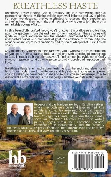 "One of the best contemporary books about the Christian life in publication today." Five-Star Amazon Review "This poignant survival guide reminds us how God forms extraordinary faith through ordinary lives. These hard-won lessons will be a path to sustain you through your own loss and longings." Katherine Wolf Author of Hope Heals and Suffer Strong Co-founder of Hope Heals ministry "Like the book of Esther from the Bible, sometimes God's presence is most known through the weaving together of our story. What begins as ordinary love and tragedy for Rebecca and Jay turns into beautiful redemption. Your story will be enriched by reading theirs." Dr. Richard Kannwischer Senior Pastor, Peachtree Presbyterian Church in Atlanta, GA "Breathless Haste reminds us that even in those moments that we are frantically racing through life, or are scared, God is always there, always steady. Through frank, page-turning stories, Rebecca and Jay Madden share crushing moments of loss and those of jubilant wonder. Read this book for the epic reminder that God walks along with us, and that by "praying for the extraordinary" and intentionally listening for his voice, He will craft these experiences to help us sing a new song." Dr. Darria Long National Bestselling Author of Mom Hacks, national TV health contributor, Emergency physician, and mom of 3 Have you faced profound loss, received devastating news, navigated career changes, or encountered financial hardships? Have you questioned your faith in God during these times? Where have you sought hope and direction? Have you wondered how to find God in the midst of it all? When the Madden family tragically lost their firstborn son in infancy, they embarked on a journey to discover God amidst their grief and continued to seek His presence thereafter. In Breathless Haste: Finding God in Ordinary Life, they share thirty diverse stories of encountering God in everyday moments - from the mundane to the miraculous: in sorrow, at a McDonalds, through music, poetry, a cassette tape, creation, a scrapbook, an old digital clock, a bankruptcy case and beyond. Each story bears witness to a living God actively involved in their lives, offering a profound testimony that the modern world desperately needs. With over twenty-five years of ministry experience in churches in South Carolina, Chicago, and Atlanta, Jay and Rebecca Madden have dedicated themselves to guiding others on their spiritual journey in churches, neighborhoods, and groups. They currently serve at one of the largest Presbyterian churches in the United States, with Jay as Executive Pastor and Rebecca as Women's Ministry Director. Their ministry is to inspire and empower others to awaken their own heart, mind, and soul to encounter an extraordinary God in their ordinary day. Through the vulnerability of their personal stories, practical insights, and thought-provoking questions in each chapter, Breathless Haste will strengthen your hope, expand your trust in God, fuel your faith, and stimulate your imagination with fresh ways to discover and experience God's guidance, peace, and purpose in your own life.