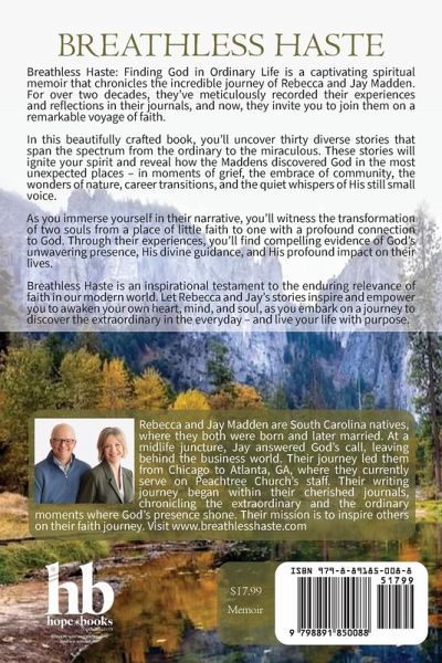 "One of the best contemporary books about the Christian life in publication today." Five-Star Amazon Review "This poignant survival guide reminds us how God forms extraordinary faith through ordinary lives. These hard-won lessons will be a path to sustain you through your own loss and longings." Katherine Wolf Author of Hope Heals and Suffer Strong Co-founder of Hope Heals ministry "Like the book of Esther from the Bible, sometimes God's presence is most known through the weaving together of our story. What begins as ordinary love and tragedy for Rebecca and Jay turns into beautiful redemption. Your story will be enriched by reading theirs." Dr. Richard Kannwischer Senior Pastor, Peachtree Presbyterian Church in Atlanta, GA "Breathless Haste reminds us that even in those moments that we are frantically racing through life, or are scared, God is always there, always steady. Through frank, page-turning stories, Rebecca and Jay Madden share crushing moments of loss and those of jubilant wonder. Read this book for the epic reminder that God walks along with us, and that by "praying for the extraordinary" and intentionally listening for his voice, He will craft these experiences to help us sing a new song." Dr. Darria Long National Bestselling Author of Mom Hacks, national TV health contributor, Emergency physician, and mom of 3 Have you faced profound loss, received devastating news, navigated career changes, or encountered financial hardships? Have you questioned your faith in God during these times? Where have you sought hope and direction? Have you wondered how to find God in the midst of it all? When the Madden family tragically lost their firstborn son in infancy, they embarked on a journey to discover God amidst their grief and continued to seek His presence thereafter. In Breathless Haste: Finding God in Ordinary Life, they share thirty diverse stories of encountering God in everyday moments - from the mundane to the miraculous: in sorrow, at a McDonalds, through music, poetry, a cassette tape, creation, a scrapbook, an old digital clock, a bankruptcy case and beyond. Each story bears witness to a living God actively involved in their lives, offering a profound testimony that the modern world desperately needs. With over twenty-five years of ministry experience in churches in South Carolina, Chicago, and Atlanta, Jay and Rebecca Madden have dedicated themselves to guiding others on their spiritual journey in churches, neighborhoods, and groups. They currently serve at one of the largest Presbyterian churches in the United States, with Jay as Executive Pastor and Rebecca as Women's Ministry Director. Their ministry is to inspire and empower others to awaken their own heart, mind, and soul to encounter an extraordinary God in their ordinary day. Through the vulnerability of their personal stories, practical insights, and thought-provoking questions in each chapter, Breathless Haste will strengthen your hope, expand your trust in God, fuel your faith, and stimulate your imagination with fresh ways to discover and experience God's guidance, peace, and purpose in your own life.