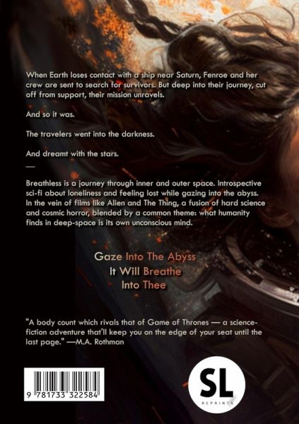 ¿When Earth loses contact with a ship near Saturn, Commander Evelyn Fenroe and her crew are sent to search for survivors. But deep into their journey, cut off from support, their mission unravels. And so it was. The travelers went into the darkness. And dreamt with the stars. ¿__ Breathless is a journey through inner and outer space. Introspective sci-fi about loneliness and feeling lost while gazing into the abyss. In the vein of films like Alien and The Thing, a fusion of hard science and cosmic horror, blended by a common theme: what humanity finds in deep-space is its own unconscious mind.