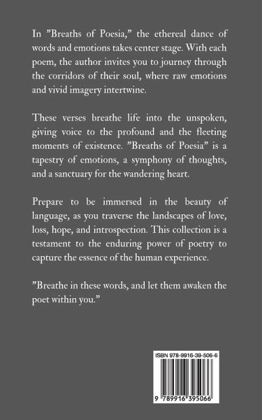 In "Breaths of Poesia," the ethereal dance of words and emotions takes center stage. With each poem, the author invites you to journey through the corridors of their soul, where raw emotions and vivid imagery intertwine. These verses breathe life into the unspoken, giving voice to the profound and the fleeting moments of existence. "Breaths of Poesia" is a tapestry of emotions, a symphony of thoughts, and a sanctuary for the wandering heart. Prepare to be immersed in the beauty of language, as you traverse the landscapes of love, loss, hope, and introspection. This collection is a testament to the enduring power of poetry to capture the essence of the human experience. Copyright © 2023 Book Fairy Publishing