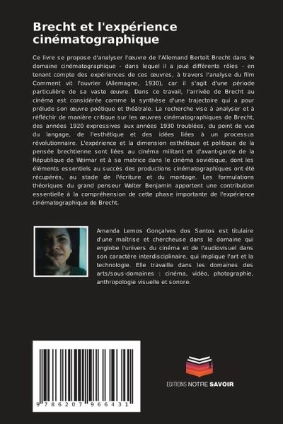Ce livre se propose d'analyser l'oeuvre de l'Allemand Bertolt Brecht dans le domaine cinématographique - dans lequel il a joué différents rôles - en tenant compte des expériences de ces oeuvres, à travers l'analyse du film Comment vit l'ouvrier (Allemagne, 1930), car il s'agit d'une période particulière de sa vaste oeuvre. Dans ce travail, l'arrivée de Brecht au cinéma est considérée comme la synthèse d'une trajectoire qui a pour prélude son oeuvre poétique et théâtrale. La recherche vise à analyser et à réfléchir de manière critique sur les oeuvres cinématographiques de Brecht, des années 1920 expressives aux années 1930 troublées, du point de vue du langage, de l'esthétique et des idées liées à un processus révolutionnaire. L'expérience et la dimension esthétique et politique de la pensée brechtienne sont liées au cinéma militant et d'avant-garde de la République de Weimar et à sa matrice dans le cinéma soviétique, dont les éléments essentiels au succès des productions cinématographiques ont été récupérés, au stade de l'écriture et du montage. Les formulations théoriques du grand penseur Walter Benjamin apportent une contribution essentielle à la compréhension de cette phase importante de l'expérience cinématographique de Brecht.