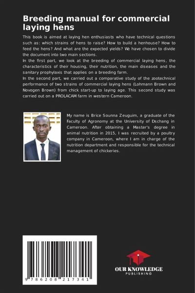 This book is aimed at laying hen enthusiasts who have technical questions such as: which strains of hens to raise? How to build a henhouse? How to feed the hens? And what are the expected yields? We have chosen to divide the document into two main sections.In the first part, we look at the breeding of commercial laying hens, the characteristics of their housing, their nutrition, the main diseases and the sanitary prophylaxis that applies on a breeding farm.In the second part, we carried out a comparative study of the zootechnical performance of two strains of commercial laying hens (Lohmann Brown and Novogen Brown) from chick start-up to laying age. This second study was carried out on a PROLACAM farm in western Cameroon.
