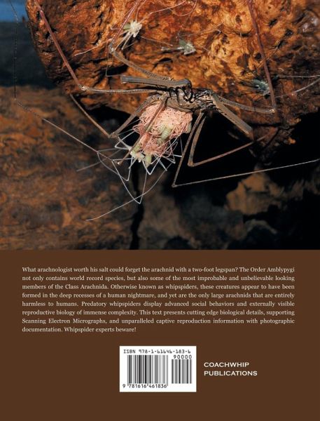 What arachnologist worth his salt could forget the arachnid with a two-foot legspan? The Order Amblypygi not only contains world record species, but also some of the most improbable and unbelievable looking members of the Class Arachnida. Otherwise known as whipspiders, these creatures appear to have been formed in the deep recesses of a human nightmare, and yet are the only large arachnids that are entirely harmless to humans. Predatory whipspiders display advanced social behaviors and externally visible reproductive biology of immense complexity. This text presents cutting edge biological details, supporting Scanning Electron Micrographs, and unparalleled captive reproduction information with photographic documentation.