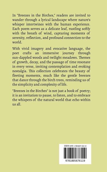 In "Breezes in the Birches," readers are invited to wander through a lyrical landscape where nature's whisper intertwines with the human experience. Each poem serves as a delicate leaf, rustling softly with the breath of wind, capturing moments of serenity, reflection, and profound connection to the world. With vivid imagery and evocative language, the poet crafts an immersive journey through sun-dappled woods and twilight meadows. Themes of growth, decay, and the passage of time resonate in every verse, inviting contemplation and evoking nostalgia. This collection celebrates the beauty of fleeting moments, much like the gentle breezes that dance through the birch trees, reminding us of the simplicity and complexity of life. "Breezes in the Birches" is not just a book of poetry; it is an invitation to pause, to listen, and to embrace the whispers of the natural world that echo within us all.