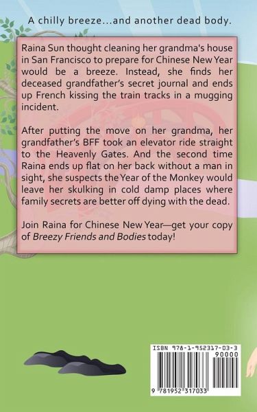 Raina Sun thought cleaning her grandma's house in San Francisco to prepare for Chinese New Year would be a breeze. Instead, she finds her deceased grandfather’s secret journal and ends up French kissing the train tracks in a mugging incident. After putting the move on her grandma, her grandfather’s BFF took an elevator ride straight to the Heavenly Gates. And the second time Raina ends up flat on her back without a man in sight, she suspects the Year of the Monkey would leave her skulking in cold damp places where family secrets are better off dying with the dead. Join Raina for Chinese New Year--get your copy of "Breezy Friends and Bodies" today!