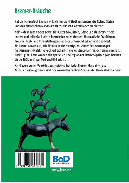 Hat die Hansestadt Bremen wirklich nur die 4 Stadtmusikanten, die Roland-Statue und den historischen Marktplatz als touristische Attraktionen zu bieten?Nein - denn hier gibt es selbst für Kurzzeit-Touristen, Gäste und Neubremer viele andere und teilweise kuriose Bremensien zu entdecken! Hanseatische Traditionen, Bräuche, Feste und Veranstaltungen sind hier umfassend erklärt und bebildert. Ein kleiner Sprachkurs, mit Einblick in die wichtigsten Bremer Redewendungen (im Missingsch-Dialekt) erleichtert sicherlich die Verständigung mit den Einheimischen. Und zu guter Letzt werden alle speziellen und regionalen Bremer-Speisen (von herzhaft bis zu Süßkrams) erklärt.Mit diesem ersten Überblick ausgestattet, hat jeder Bremen-Gast eine gute Orientierungsmöglichkeit und den maximalen Erlebnis-Spaß in der Hansestadt-Bremen!