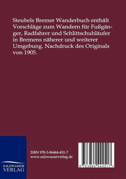 Steubels Bremer Wanderbuch enthält Vorschläge zum Wandern für Fußgänger, Radfahrer und Schlittschuhläufer in Bremens näherer und weiterer Umgebung. Nachdruck des Originals von 1905.