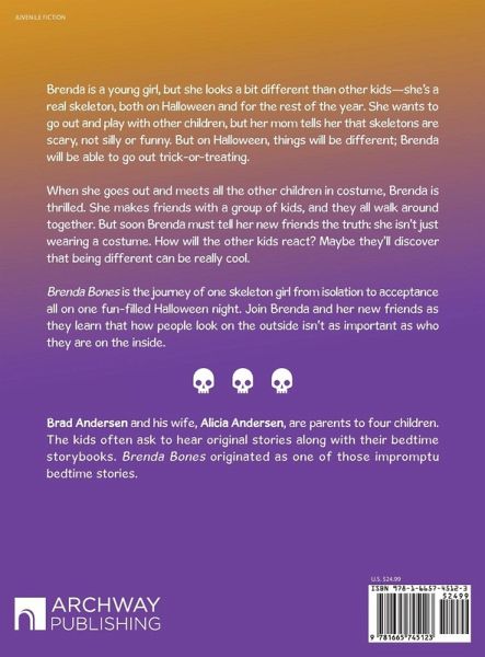 Brenda is a young girl, but she looks a bit different than other kids-she's a real skeleton, both on Halloween and for the rest of the year. She wants to go out and play with other children, but her mom tells her that skeletons are scary, not silly or funny. But on Halloween, things will be different; Brenda will be able to go out trick-or-treating. When she goes out and meets all the other children in costume, Brenda is thrilled. She makes friends with a group of kids, and they all walk around together. But soon Brenda must tell her new friends the truth: she isn't just wearing a costume. How will the other kids react? Maybe they'll discover that being different can be really cool. Brenda Bones is the journey of one skeleton girl from isolation to acceptance all on one fun-filled Halloween night. Join Brenda and her new friends as they learn that how people look on the outside isn't as important as who they are on the inside.