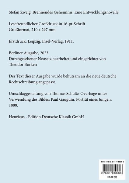Stefan Zweig: Brennendes Geheimnis. Eine EntwicklungsnovelleLesefreundlicher Großdruck in 16-pt-SchriftGroßformat, 210 x 297 mmBerliner Ausgabe, 2023Durchgesehener Neusatz bearbeitet und eingerichtet von Theodor BorkenErstdruck: Leipzig, Insel-Verlag, 1911.Der Text dieser Ausgabe wurde behutsam an die neue deutsche Rechtschreibung angepasst.Umschlagabbildung: Paul Gauguin, Porträt eines Jungen, 1888Gesetzt aus der Minion Pro, 16 pt.Henricus - Edition Deutsche Klassik GmbHÜber den Autor:1881 in eine großbürgerliche Unternehmerfamilie in Wien hineingeboren, beginnt Stefan Zweig noch bevor er sein Abitur ablegt mit der Veröffentlichung erster Gedichte. Eine rasante Schriftstellerkarriere steht ihm bevor. 1928 - Zweig ist 47 Jahre alt - erscheint die Biografie »Stefan Zweig, der Mann und das Werk«. Letzteres war bereits im Jahr zuvor in einer zehnbändigen Ausgabe mit einer Einleitung von Maxim Gorki in russischer Übersetzung erschienen. Er ist einer der meistübersetzten Schriftsteller seiner Zeit, seine Werke erreichen Auflagen von mehr als 100.000 Exemplaren und werden oft verfilmt. Zu seinem 50. Geburtstag bilanziert Stefan Zweig: »Eigentlich hätte man jetzt genug vom Leben. Was jetzt noch kommen kann, ist doch nichts als Abstieg.« Und er sollte auf tragische Weise recht behalten. 1933 sieht er in dem Ausbrechen des Nationalsozialismus bereits ein »Vorspiel zu viel weiterreichenden Eingriffen«. Ein Jahr darauf verlässt er seine Heimat. In Deutschland werden seine Bücher verboten und verbrannt. Zweig lebt zunächst in England im Exil, 1941 kommt er - nach einer Station im Staat New York - schließlich nach Brasilien, wo er am 22. Februar 1942 »aus freiem Willen und mit klaren Sinnen« aus dem Leben scheidet. In seinem Abschiedsbrief sieht er die Welt seiner eigenen Sprache untergegangen und seine geistige Heimat Europa vernichtet. Der letzte Gruß an seine Freunde schließt mit dem Wunsch: »Mögen sie die Morgenröte noch sehen nach der langen Nacht! Ich, allzu Ungeduldiger, gehe ihnen voraus.«
