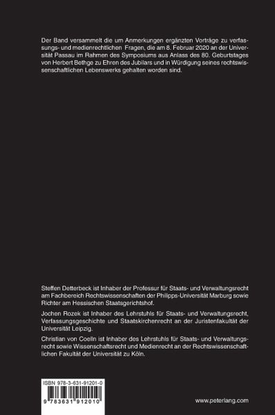 Der Band versammelt die um Anmerkungen ergänzten Vorträge zu verfassungs- und medienrechtlichen Fragen, die am 8. Februar 2020 an der Universität Passau im Rahmen des Symposiums aus Anlass des 80. Geburtstages von Herbert Bethge zu Ehren des Jubilars und in Würdigung seines rechtswissenschaftlichen Lebenswerks gehalten worden sind.