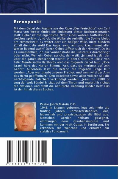 Mit dem Gebet der Agathe aus der Oper "Der Freischütz" von Carl Maria von Weber findet die Einleitung dieser Buchpräsentation statt: Gebet ist die eigentliche Natur eines wahren Gotteskindes, welches spricht: "Und ob die Wolke sie verhülle, die Sonne bleibt am Himmelszelt; es waltet dort ein heil'ger Wille, nicht blindem Zufall dient die Welt! Das Auge, ewig rein und klar, nimmt aller Wesen liebend wahr!" Durch Gebet "öffnet sich der Himmel". Da ist es unwesentlich, ob ein Sonnenstrahl die Finsternis durchdringt oder nicht. Wer ein Gebet spricht, der weiß: "Jemand ist da, der über die ganze Menschheit wacht!" In dem Oratorium "Elias" von Felix Mendelssohn Bartholdy wird das folgende Gebet laut: "Höre Israel, höre des Herren Stimme! Ach, dass du merktest auf sein Gebot!" Außerdem lässt die Beterin die folgende Frage laut werden: "Aber wer glaubt unserer Predigt, und wem wird der Arm des Herrn geoffenbart?" Den Israeliten sowie allen Völkern soll die nachfolgende Botschaft verkündigt werden: "Jesus ist HERR! Er trug der Welt Sünde! Er sitzt auf dem Thron und regiert! Er richtet die Nationen und stellt die natürliche Ordnung wieder her!" Das ist der Inhalt dieses Buches.