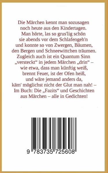 Die Märchen kennt man sozusagen noch heute aus den Kindertagen. Man hörte, las so grus'lig schön sie abends vor dem Schlafengeh'n und konnte so von Zwergen, Bäumen,den Bergen und Schneewittchen träumen.Zugleich auch ist ein Quantum Sinn "versteckt" in jedem Märchen "drin" -wie etwa, dass die Hexe weiß,brennt Feuer, ist der Ofen heißund wäre jemand anders da,käm' möglichst nicht der Glut man nah! -Im Buch: Die "Fazits" und Geschichtenaus Märchen - alle in Gedichten!