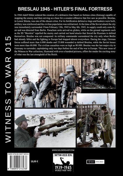 In 1944 Adolf Hitler ordered the creation of a defensive line based on fortress cities (festung) capable of stopping the enemy and then serving as a base for a counter-offensive that few saw as possible. Breslau, in Lower Silesia, was one of the chosen cities. For its fortification defensive rings and bunkers were built, artillery was reinforced and the civilian population was militarized. At the time of the Soviet attack the city was immediately surrounded. From February 13th, 1945 to May 6th, 1945, its supply could only come by air and was directed from Berlin. Parachute units arrived on gliders, while on the ground regiments such as the SS "Besslein" repelled the enemy and carried out hand attacks that forced the Russians to defend themselves. Breslau was not conquered: its military commander surrendered the city only when Berlin had already fallen and the fighting in Europe had stopped almost everywhere. During the siege, German forces suffered more than 6.000 deaths and 23.000 wounded to defend Breslau, while the Soviet losses were more than 60.000. The civilian casualties were as high as 80.000. Breslau was the last major city in Germany to surrender, capitulating only two days before the end of the war in Europe. This new issue of the Witness to War collection, illustrated with over a hundred pictures, offers the reader the exciting story of what was the last stronghold of the Reich.