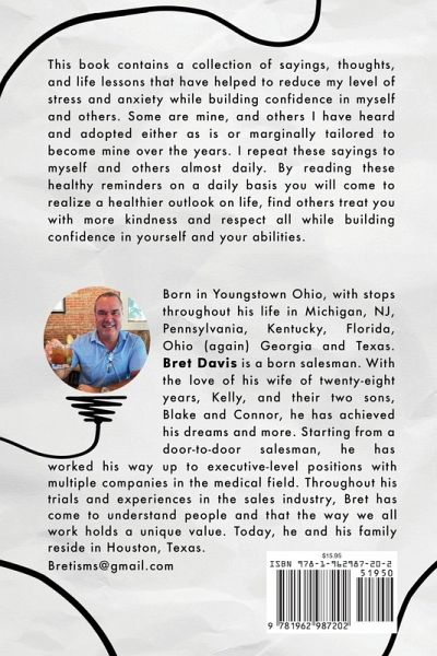 Bretisms: Adopted, Borrowed and Modified Philosophies for a life with LESS Anxiety and MORE CONFIDENCE Reduce your anxiety and build confidence in just 30 days with the Bretisms approach. This inspiring book contains a collection of sayings, thoughts, and life lessons to help reduce stress and anxiety while building confidence in yourself and others. Designed for you to read only one chapter per day, this method gives you time to absorb each life lesson and focus on it for an entire day before moving on. Each of the 30 chapters starts with a "Bretism"-an inspirational quote-followed by an in-depth explanation and then helpful tips to apply the lesson to your life. Every chapter concludes with a short and impactful call to action for you to practice. After finishing the 30 lessons, you can choose which chapter to revisit on any given day to reduce your anxiety and build your confidence to overcome that day's challenge. Reading these healthy reminders on a daily basis will lead to: - A healthier outlook on life- Increased confidence in your abilities- More patience with others- Decrease in needing reassurance from outside sources- More love for yourself Start living your best life now! Buy a copy of Bretisms today by clicking the BUY NOW button at the top of this page.