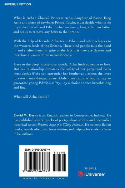 What is Acha's Choice? Princess Acha, daughter of Saxon King Aelle and sister of newborn Prince Edwin, must decide what to do to protect herself and Edwin when an enemy king kills their father and seeks to remove any heirs to the throne. With the help of friends, Acha takes Edwin and other refugees to the western lands of the Britons. These kind people take the band in and shelter them, in spite of the fact that they are Saxons and therefore enemies of the native Britons. Here in the deep, mysterious woods, Acha finds someone to love. But her relationship threatens the safety of her party, and Acha must decide if she can surrender her brother and others she loves to return into danger, alone. Only then can she find a way to guarantee young Edwin's safety.by a choice at once breathtaking and final. What will Acha decide?