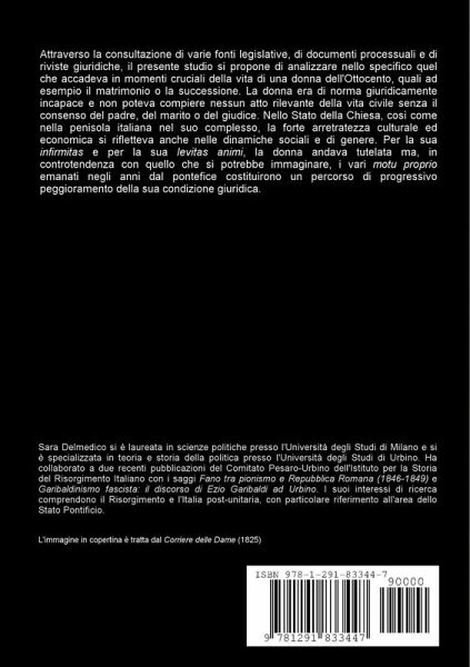 Attraverso la consultazione di varie fonti legislative, di documenti processuali e di riviste giuridiche, il presente studio si propone di analizzare nello specifico quel che accadeva in momenti cruciali della vita di una donna dell'Ottocento, quali ad esempio il matrimonio o la successione. La donna era di norma giuridicamente incapace e non poteva compiere nessun atto rilevante della vita civile senza il consenso del padre, del marito o del giudice. Nello Stato della Chiesa, così come nella penisola italiana nel suo complesso, la forte arretratezza culturale ed economica si rifletteva anche nelle dinamiche sociali e di genere. Per la sua infirmitas e per la sua levitas animi, la donna andava tutelata ma, in controtendenza con quello che si potrebbe immaginare, i vari motu proprio emanati negli anni dal pontefice costituirono un percorso di progressivo peggioramento della sua condizione giuridica.