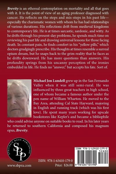 Brevity is an ethereal contemplation on mortality and all that goes with it. It is the point of view of an aging professor diagnosed with cancer. He reflects on the steps and mis-steps in his past life--especially the charismatic women with whom he has had relationships of various durations. His reflections drift from medieval kingdoms to contemporary life. He is at times sarcastic, sardonic, and witty. As he drifts through his present-day problems, he spends much time on reviewing his past life and drawing universal lessons for those facing death. In constant pain, he finds comfort in his "yellow pills," which doctors grudgingly prescribe. His thoughts at times resemble a surreal opium dream, but he snaps back to the grim reality that he faces as he drifts downward. He has more questions than answers. His profundity springs from his uncanny perception of the ironies embedded in life. He finds no "answer," but accepts his fate. Sort of. About the Author:Michael Jon Lundell grew up in the San Fernando Valley when it was still semi-rural. He was influenced by three great teachers in high school, one of whom became a famous author under the pen name of William Wharton. He moved to the Bay Area, attending Cal State Hayward, majoring in English and running track (which was his first love). He spent many years working for upscale bookstores like Kepler's and became a bibliophile who could advise anyone on suitable books to read. In his later years he returned to southern California and composed his magnum opus, Brevity.