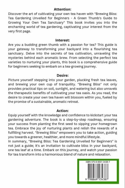 Welcome to "Brewing Bliss: Tea Gardening Unveiled for Beginners - A Green Thumb's Guide to Growing Your Own Tea Sanctuary." In the hustle and bustle of modern life, the idea of cultivating your own tea garden offers a refreshing escape and a journey into the soothing realm of tea culture. This comprehensive guide is designed for beginners eager to embark on the enriching adventure of tea gardening, providing insights into the art of nurturing tea plants and creating a personal sanctuary for tea enthusiasts. Tea, with its rich cultural history and diverse flavors, has long been cherished as more than just a beverage. "Brewing Bliss" invites you to explore the joy of growing your own tea, from selecting the perfect tea varieties to crafting a serene tea corner where you can savor the fruits of your labor. Whether you're a gardening novice or a seasoned green thumb, this guide will equip you with the knowledge and skills needed to cultivate a thriving tea garden right at home. In the opening chapters, we'll delve into the basics of tea gardening, demystifying the world of tea varieties and guiding you in selecting the most suitable plants for your unique space. As we progress, you'll learn the art of planning and designing your tea sanctuary, understanding the nuances of soil preparation, and mastering the delicate balance of watering, fertilizing, and pest control.