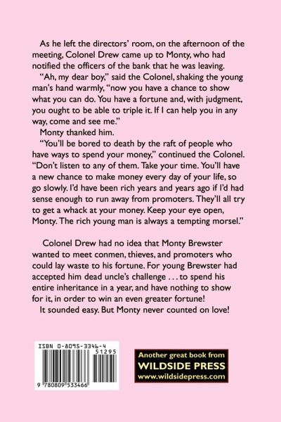 New York, 1900. Montgomery Brewster is a man of great potential. Heir to his uncle's fortune, he is a playboy, very much the American equivalent of P.G. Wodehouse's Bertie Wooster. However, unlike Bertie, Monty Brewster has a shrewd intellect behind his shallow exterior. Following his uncle's death, he discovers the old man has bequeathed one million dollars to him . . . or, if he is up to the challenge, he can win 7 million by spending the one million dollar inheritance within the space of a year. When Monty decides to go for the big jackpot, he has to keep his plans a secret from everyone -- even though it may cost him his fiancee and his friends!