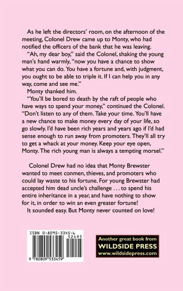 Montgomery Brewster is a man of great potential. Heir to his uncle's fortune, he is a playboy, very much the American equivalent of P.G. Wodehouse's Bertie Wooster. However, unlike Bertie, Monty Brewster has a shrewd intellect behind his shallow exterior. Following his uncle's death, he discovers the old man has bequeathed one million dollars to him . . . or, if he is up to the challenge, he can win 7 million by spending the one million dollar inheritance within the space of a year. When Monty decides to go for the big jackpot, he has to keep his plans a secret from everyone -- even though it may cost him his fiancee and his friends!