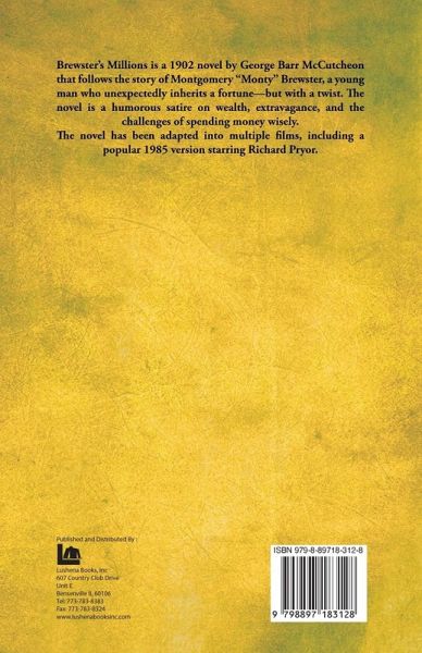 Brewster's Millions is a 1902 novel by George Barr McCutcheon that follows the story of Montgomery "Monty" Brewster, a young man who unexpectedly inherits a fortune-but with a twist. The novel is a humorous satire on wealth, extravagance, and the challenges of spending money wisely. The novel has been adapted into multiple films, including a popular 1985 version starring Richard Pryor.