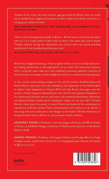 In this incisive book, leading analysts of UK and EU politics Geoffrey Evans and Anand Menon step back from the immediacy and hyperbole of the Referendum to explain what happened on 23 June 2016, and why. Brexit, they argue, was the product of both long-term dissatisfaction with the EU and a gradual breakdown in the relationship between parties and voters that spawned detachment, disinterest and disenchantment. Exploring its subsequent impact on the June 2017 General Election, they reveal the extent to which Brexit has shattered the contemporary equilibrium of British politics. These reverberations will continue to be felt for a very long time and could pose a real danger to the health of British democracy if the government fails to deliver on the promises linked to Brexit.