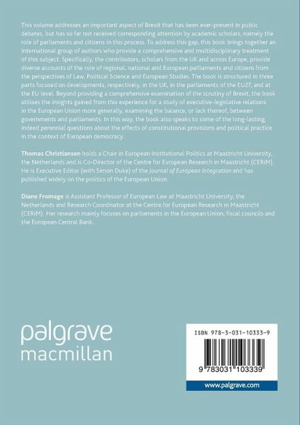 This volume addresses an important aspect of Brexit that has been ever-present in public debates, but has so far not received corresponding attention by academic scholars, namely the role of parliaments and citizens in this process. To address this gap, this book brings together an international group of authors who provide a comprehensive and multidisciplinary treatment of this subject. Specifically, the contributors, scholars from the UK and across Europe, provide diverse accounts of the role of regional, national and European parliaments and citizens from the perspectives of Law, Political Science and European Studies. The book is structured in three parts focused on developments, respectively, in the UK, in the parliaments of the EU27, and at the EU level. Beyond providing a comprehensive examination of the scrutiny of Brexit, the book utilises the insights gained from this experience for a study of executive-legislative relations in the European Union more generally, examining the balance, or lack thereof, between governments and parliaments. In this way, the book also speaks to some of the long-lasting, indeed perennial questions about the effects of constitutional provisions and political practice in the context of European democracy.