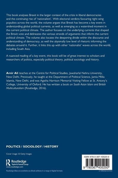 This book analyses Brexit in the larger context of the crisis in liberal democracies and the continuing rise of 'nationalism'. With electoral verdicts favouring right-wing populists across the world, the volume argues that Brexit has become a key event in understanding global political currents, as well as emerging as a watershed moment in the current political climate. The author focuses on the underlying currents that shaped the Brexit vote and delineates the various strands of arguments that inform the current political climate. The volume also locates the deepening divide within the discourse and understanding of democracy, as well the abysmally low level of rhetoric informing the debates around it. Further, it links this up with other 'nationalist' waves across the world, including South Asia.