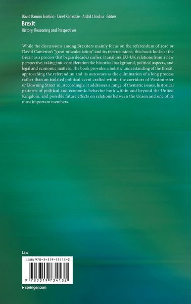 While the discussions among Brexiters mainly focus on the referendum of 2016 or David Cameron's "great miscalculation" and its repercussions, this book looks at the Brexit as a process that began decades earlier. It analyses EU-UK relations from a new perspective, taking into consideration the historical background, political aspects, and legal and economic matters. The book provides a holistic understanding of the Brexit, approaching the referendum and its outcomes as the culmination of a long process rather than an isolated political event crafted within the corridors of Westminster or Downing Street 10. Accordingly, it addresses a range of thematic issues, historical patterns of political and economic behavior both within and beyond the United Kingdom, and possible future effects on relations between the Union and one of its most important members.