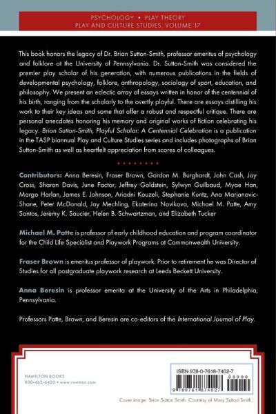 This book honors the legacy of Dr. Brian Sutton-Smith, Professor Emeritus of Psychology and Folklore at the University of Pennsylvania. Dr. Sutton-Smith was considered the premier play scholar of his generation, with numerous publications in the fields of developmental psychology, folklore, anthropology, sociology of sport, education, and philosophy. We present an eclectic array of essays written in honor of the centennial of his birth, ranging from the scholarly to the overtly playful. There are essays distilling his work to their key ideas and some that offer a robust and respectful critique. There are personal anecdotes honoring his memory, and original works of fiction celebrating his legacy. The book is a publication in the TASP biannual Play and Culture Studies series and includes photographs of Brian Sutton-Smith, as well as heartfelt appreciation from scores of colleagues.